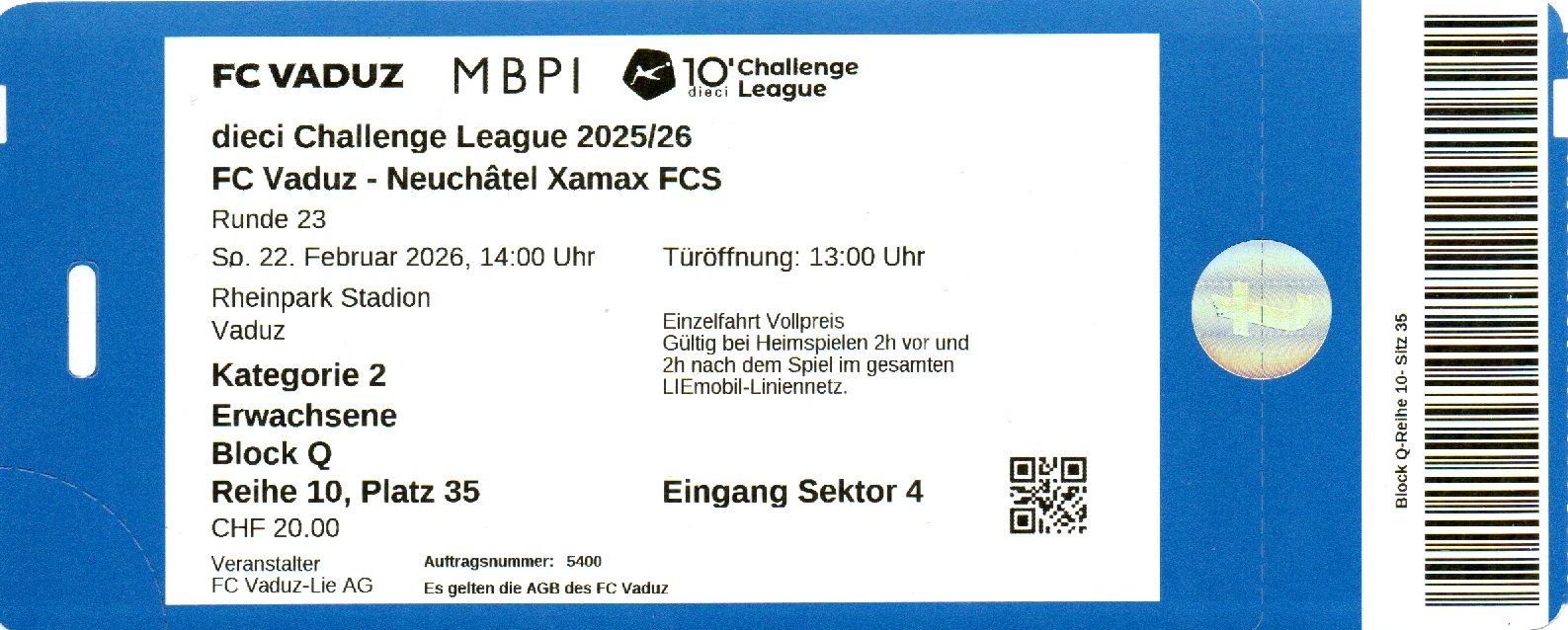 Ticket for FC Vaduz v Neuchatel Xamax