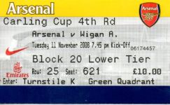 |  |   | Bloody hell managed to get a ticket at last but how hard! Just shy of 60,000 to watch Arsenal kids in a competition most fans seem to have given up on. My mate tony had been to watch Wigan a couple of times which allowed him to apply for tickets i dont think any were on a general sale, he was successful in getting two but as it happened he ended up unable to go so i took my dad instead parking on the outskirts of London and getting the tube in. We were in the Wigan end but they hadn't sold there allocation and it ended up were some tickets were resold to Arsenal fans. We were quite low down so the view wasn't great for what looked like a nice stadium. One Wigan fan decided to pipe up singing 'if you've got a wigan postcode clap your hands' not aimed at us but if they didn't have the support to fill their allocation whos fault is that? Koumas made a cameo apperance but failed to impress and was subbed