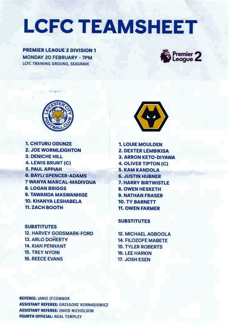 Programme for Leicester City U21 v Wolverhampton Wanderers U21