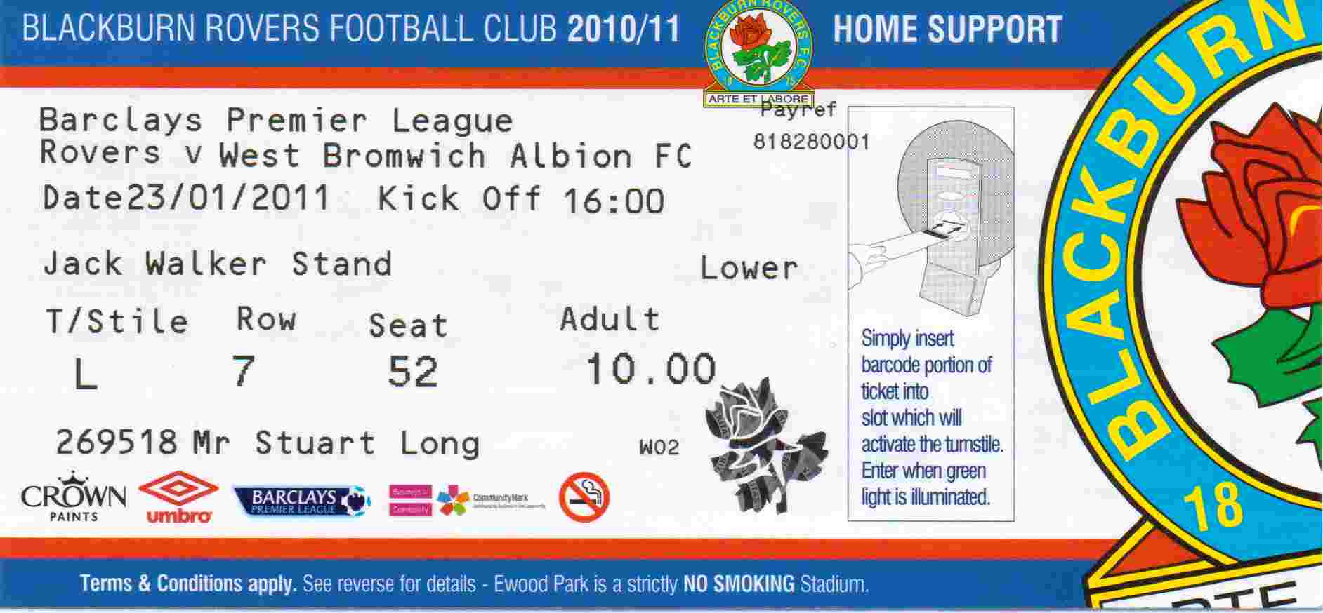 Ticket for Blackburn Rovers v West Bromwich Albion